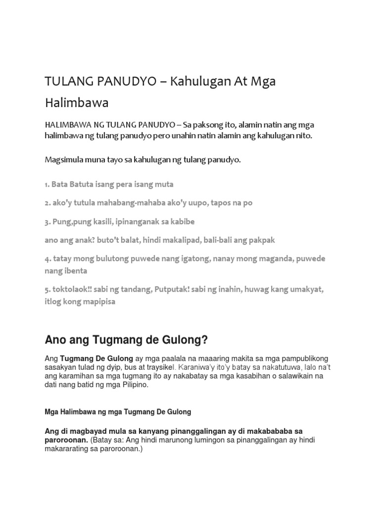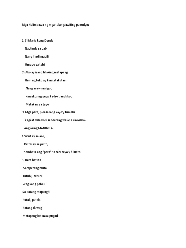 Tulang Awiting Panudyo - Ito ay isang uri ng akdanh patula na kadalasan ang layunin ay manlibak manukso o mang-uyam. Bata batuta Samperang muta. 10 posts published by parasapinga during January 2014.